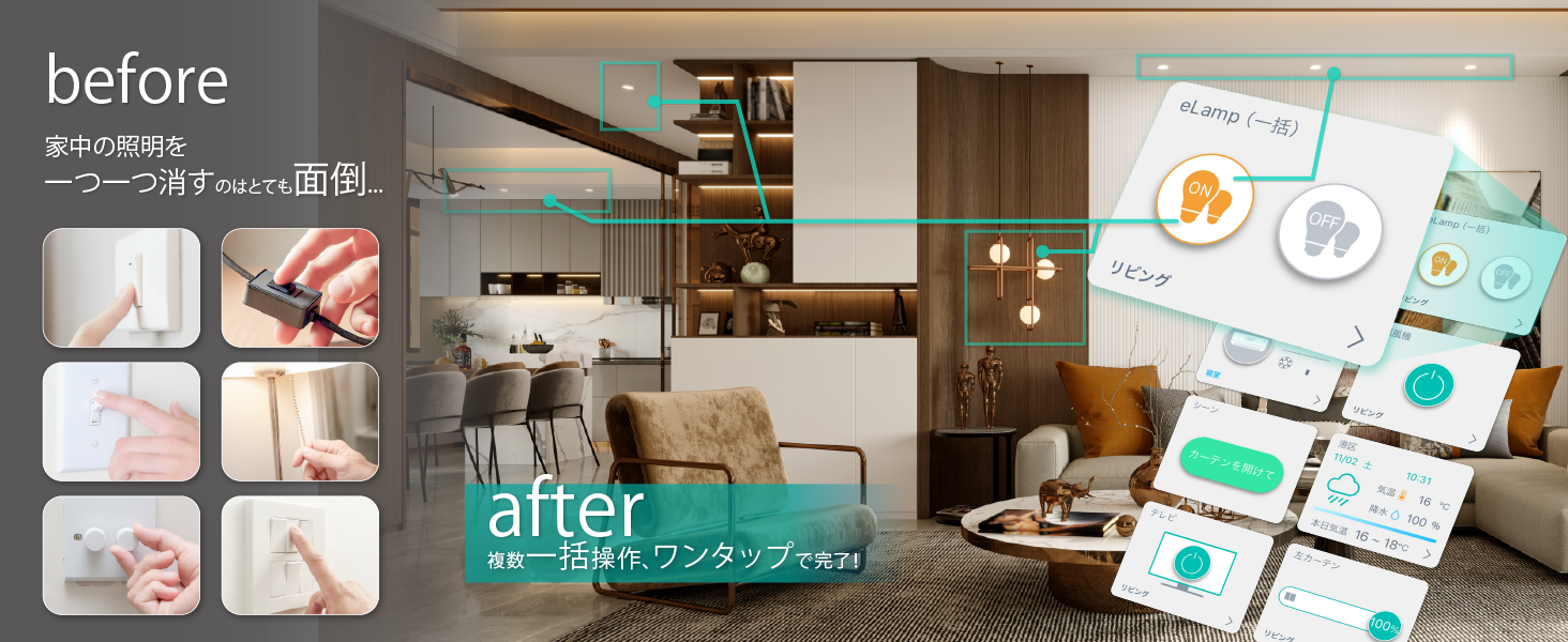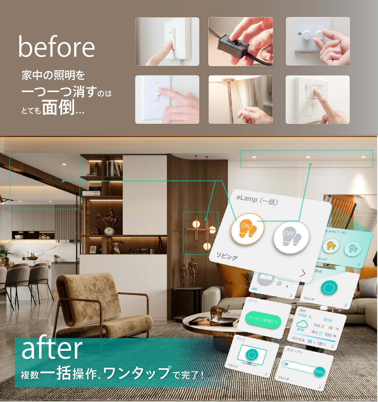 複数の電球を一括操作でき、家中の照明を一つずつ点けたり消したりする手間を省けます。