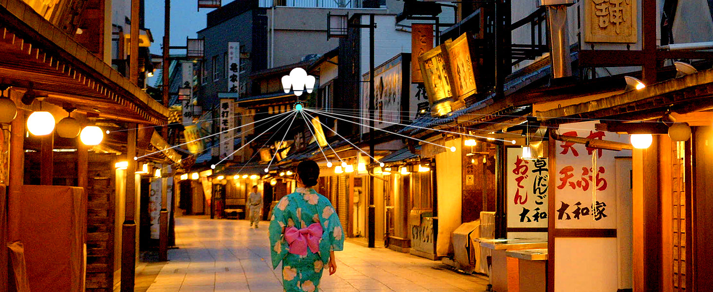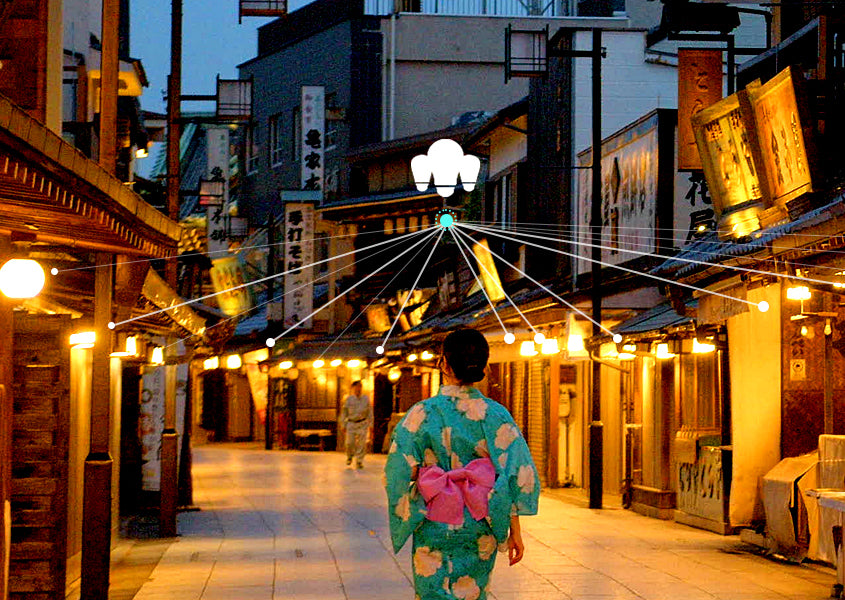 柴又帝釈天参道で開催された「第45回寅さんまつり」では、100台以上の「eLamp2」を1台のスマートフォンで一括操作し、商店街全体をカラフルで幻想的な光で彩りました。