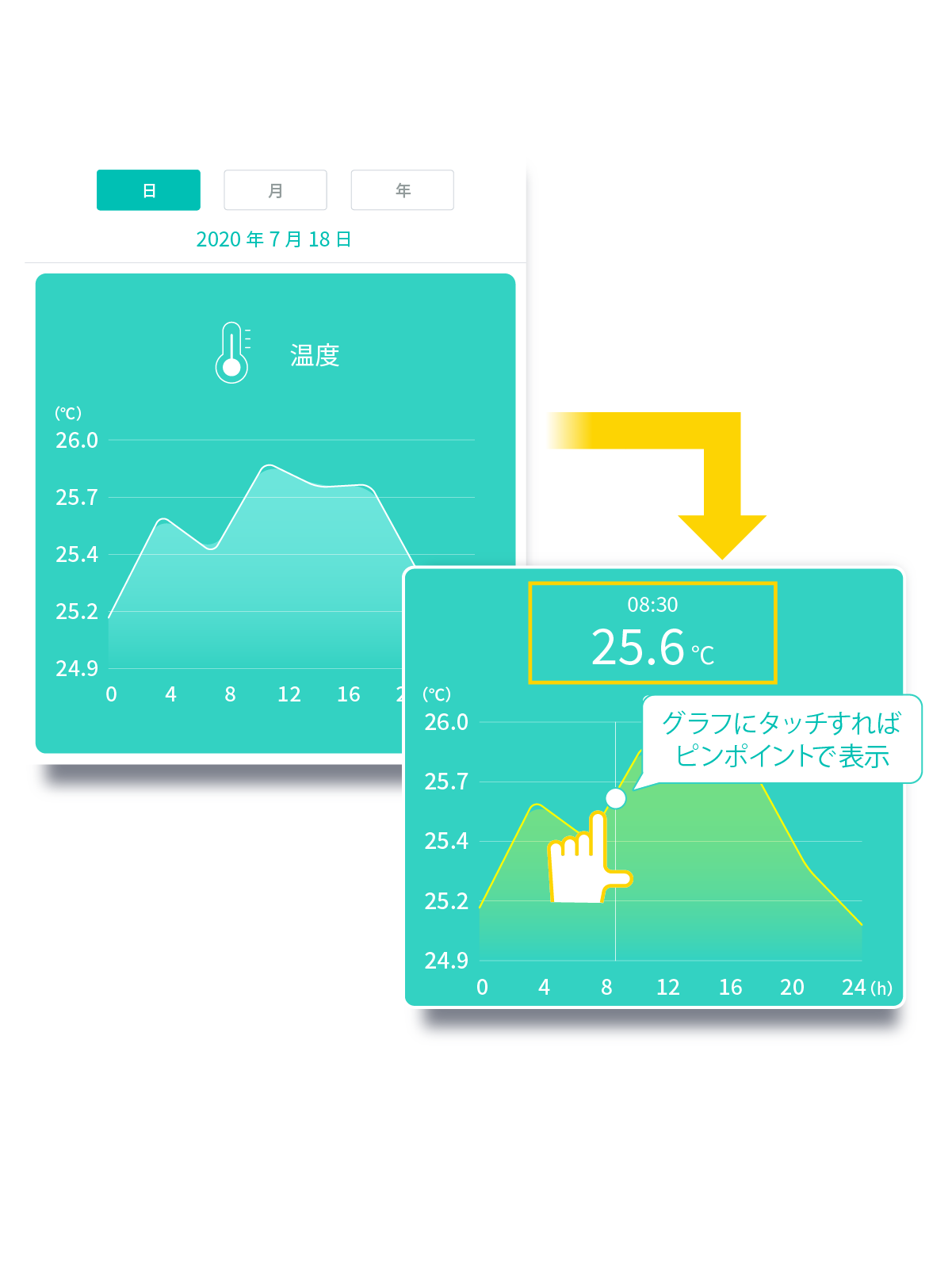 温度・湿度をグラフや数字で確認できる。日、月、年別のデータも分かれる。