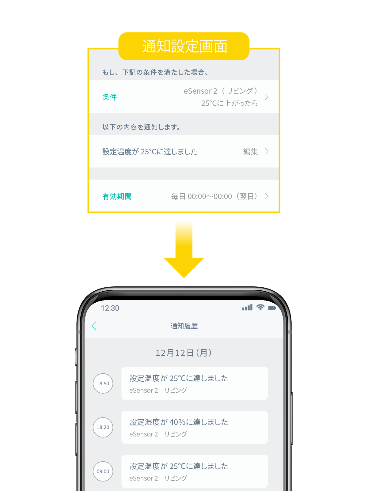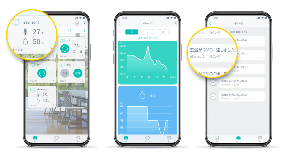 温度が25℃以上、湿度が40%以下など条件を設定すると、スマホで通知を受けられます。